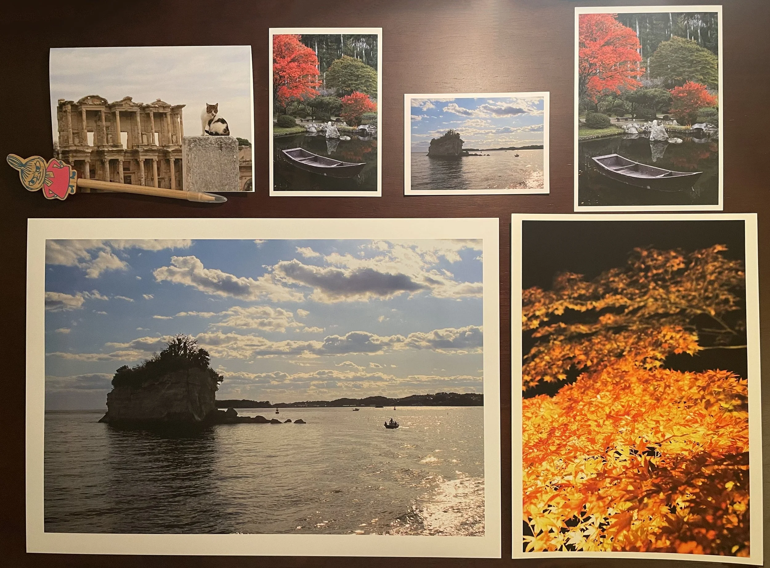 Prints come in L size, postcard size, 2L, A4, or A3. The sizes are written in inches and centimeters on the picture to the bottom left. Photographs are on glossy paper and art work is on matte paper.